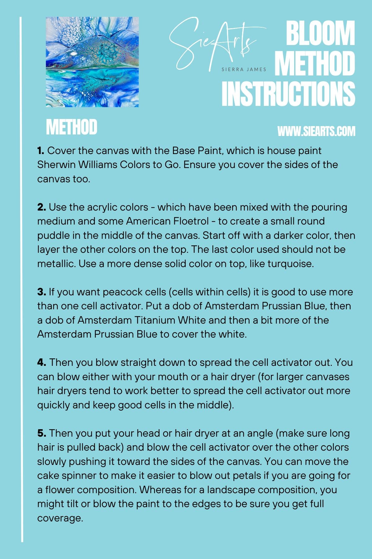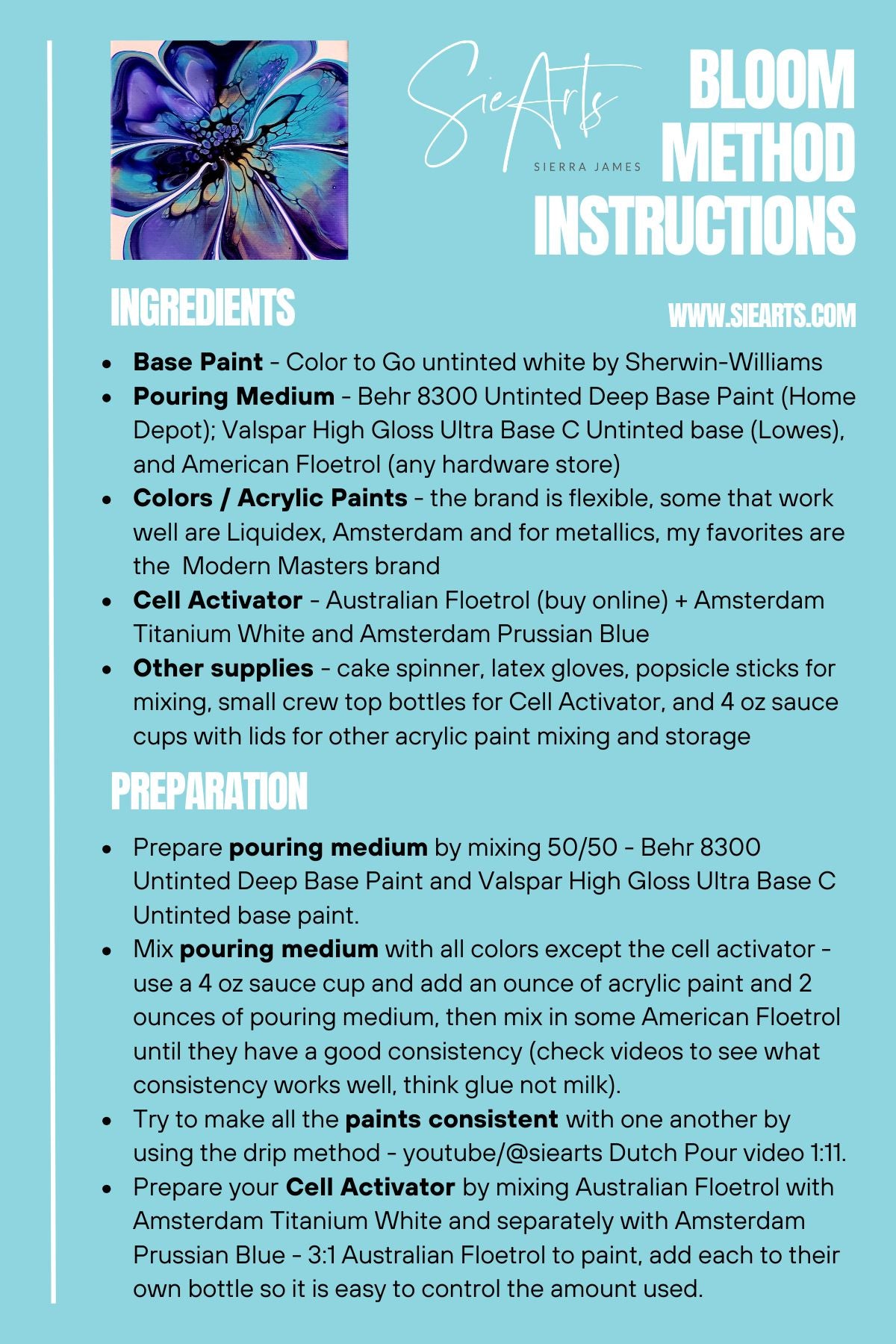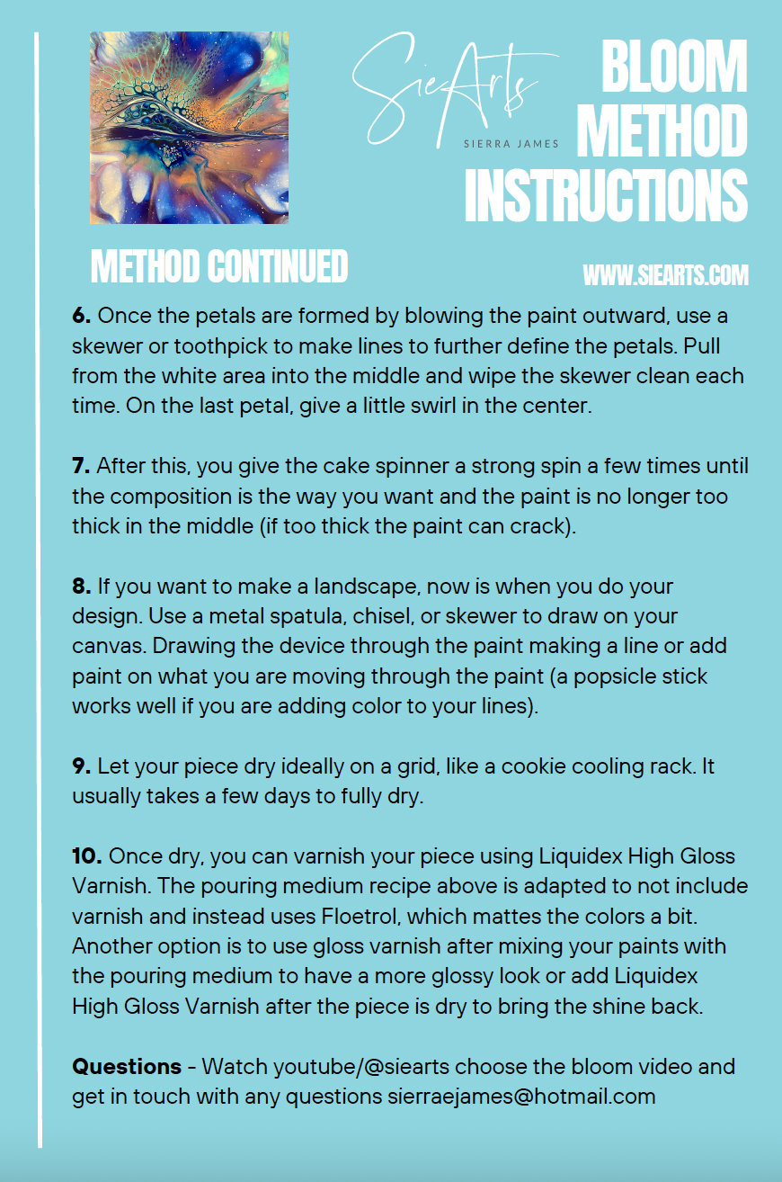 Sierra James makes fluid art videos including those about blooms, string pull, dutch pour and many more methods. She also offers her free fluid are bloom recipe.