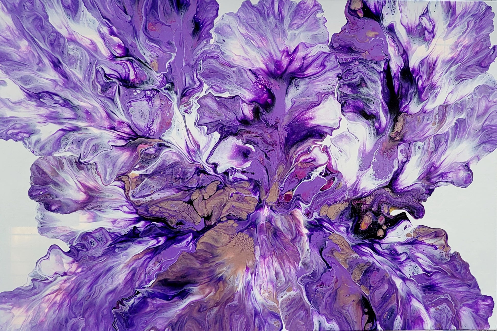 Sierra James painted this gorgeous iris with the Dutch Pour method on a gallery-wrapped canvas. The artist has uniquely hand-poured this piece with crescendoing purples, white, and rose gold hues.